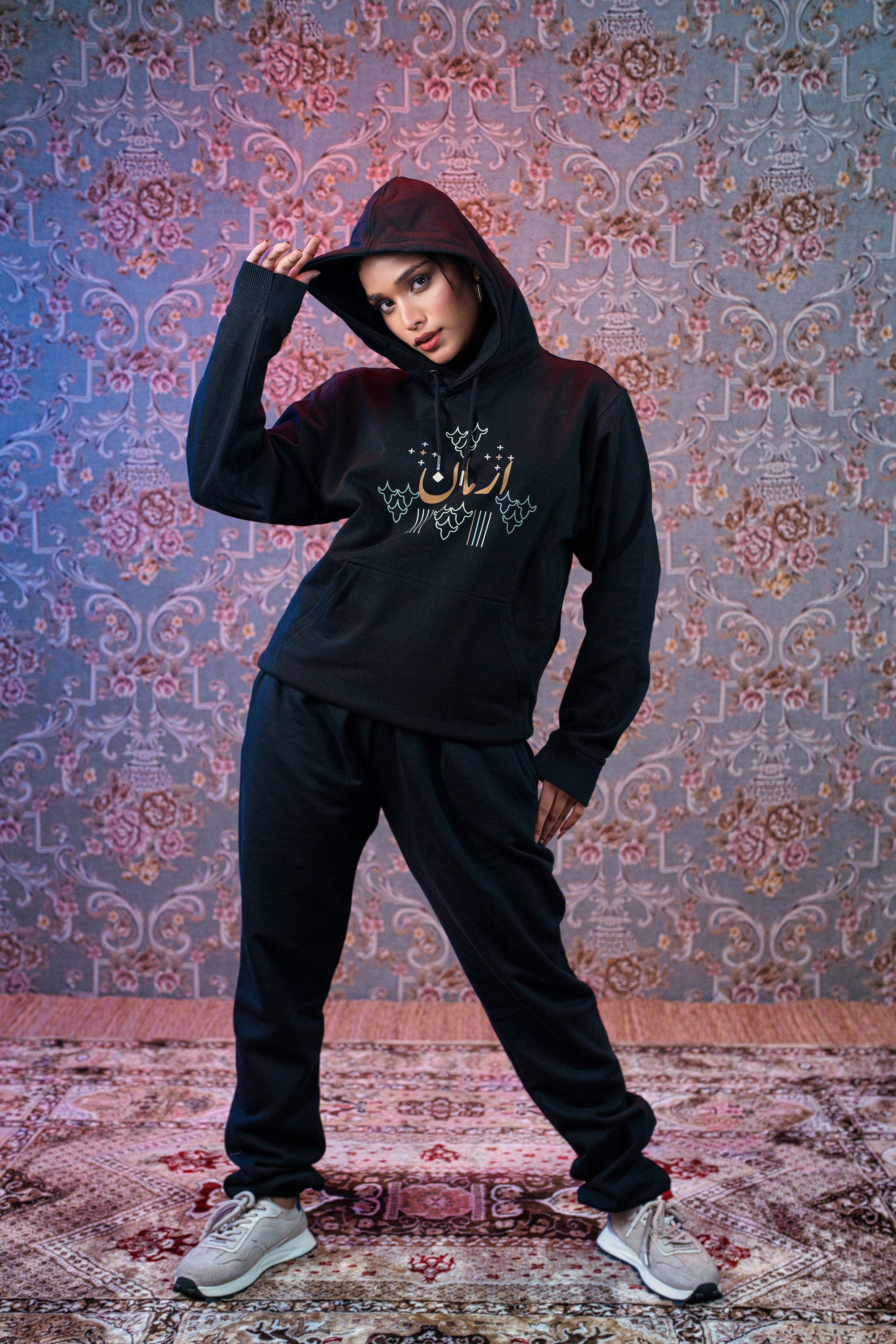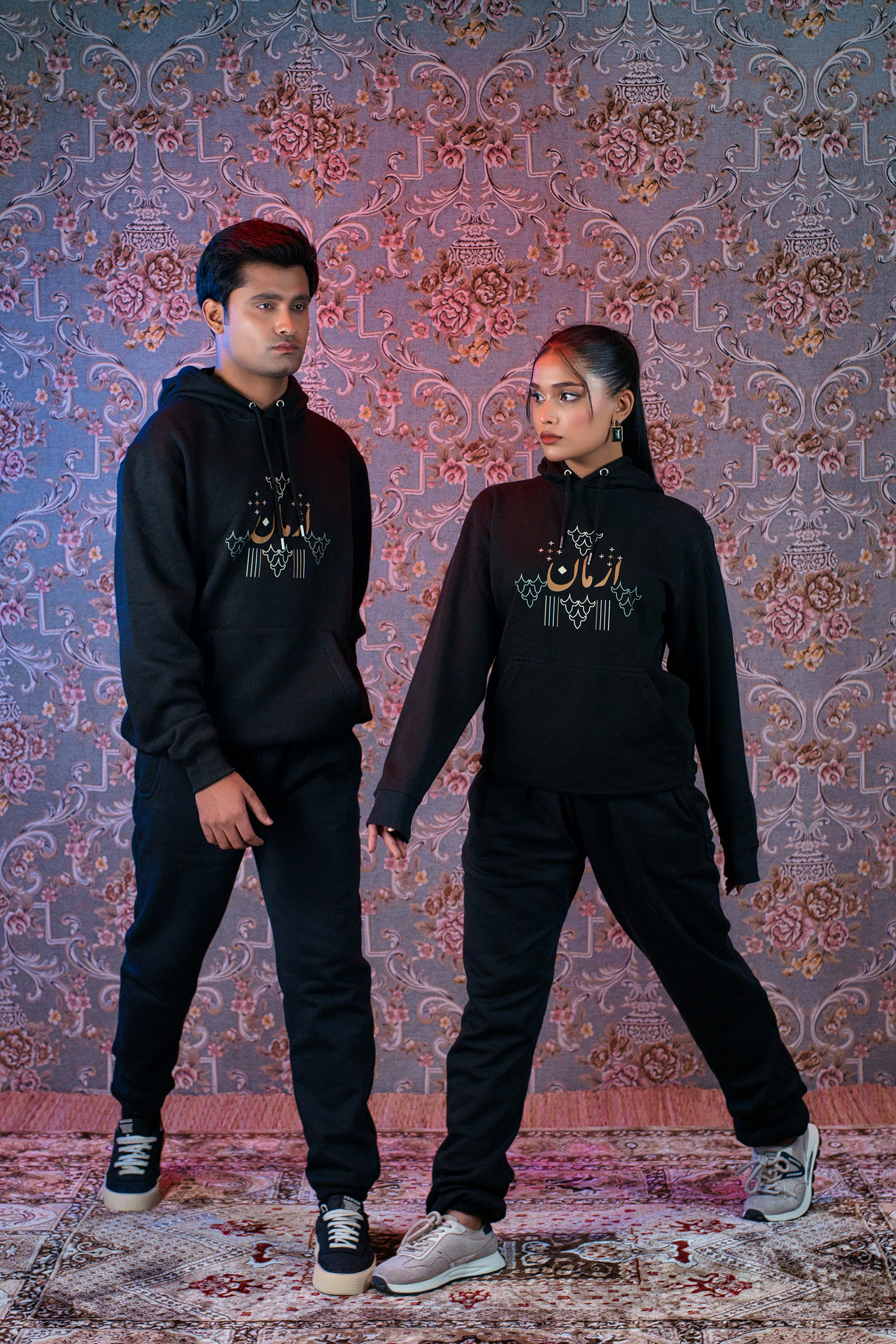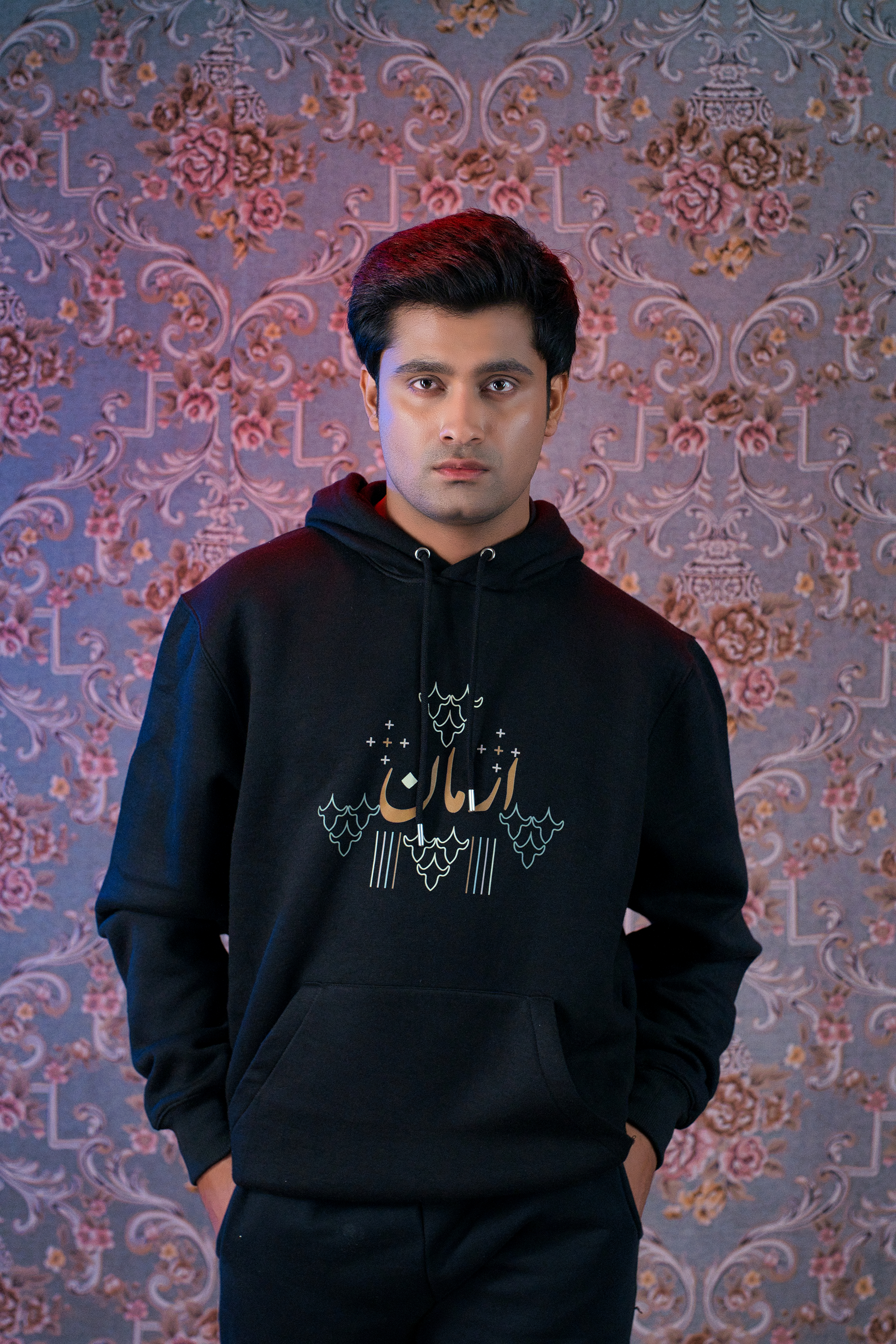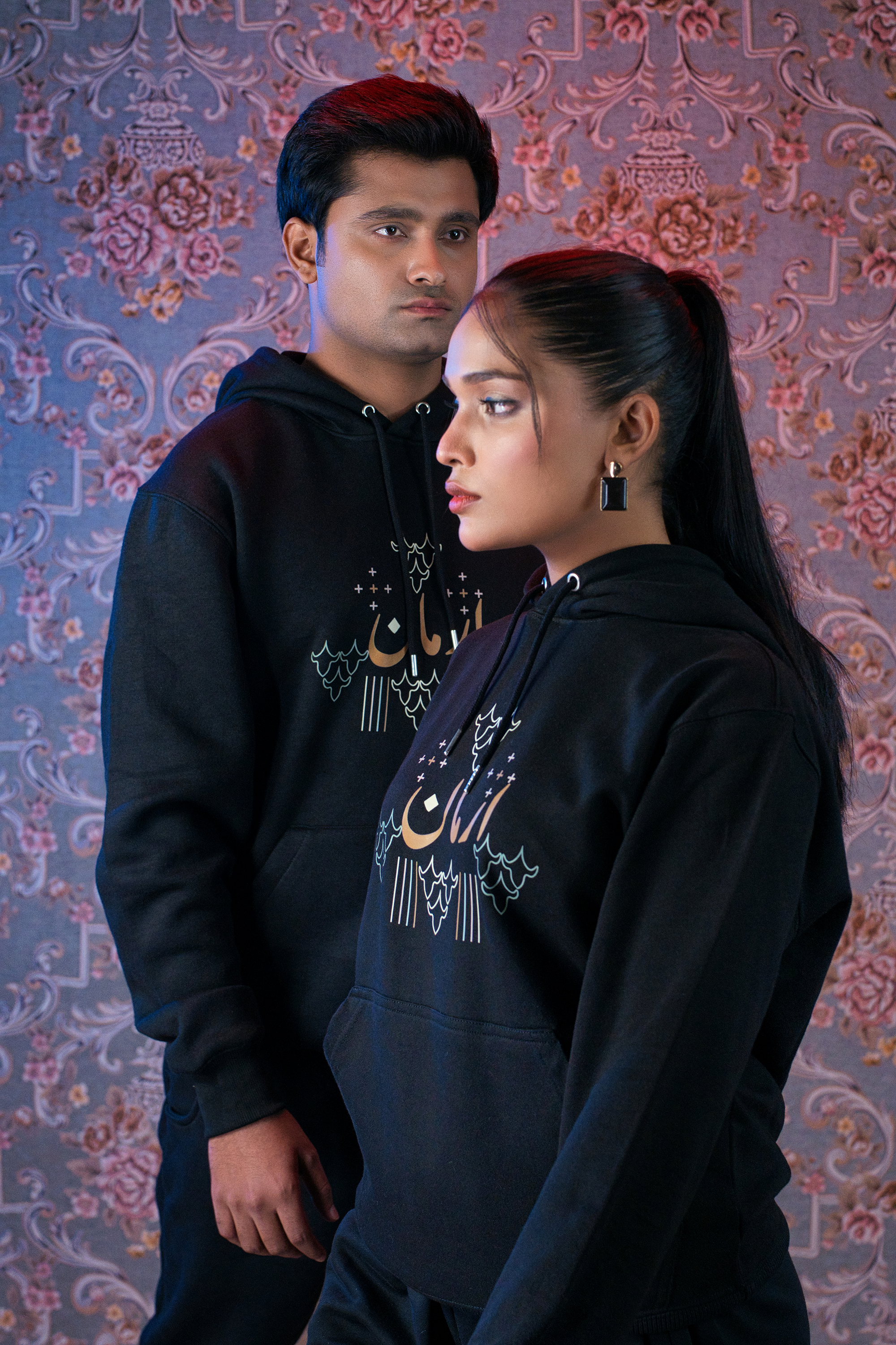 The Arman Black Hoodie & Sweatpants from the Shayarism Collection by Ghalib is a perfect fusion of minimalist design and timeless comfort. This matching set exudes a contemporary style, ideal for those who appreciate elegance in simplicity. The hoodie features a clean design with subtle, artistic detailing inspired by Ghalib's poetic essence, while the sweatpants offer a tailored fit for everyday wear. Crafted from a premium cotton-polyester blend, it provides warmth, durability, and softness against the skin.