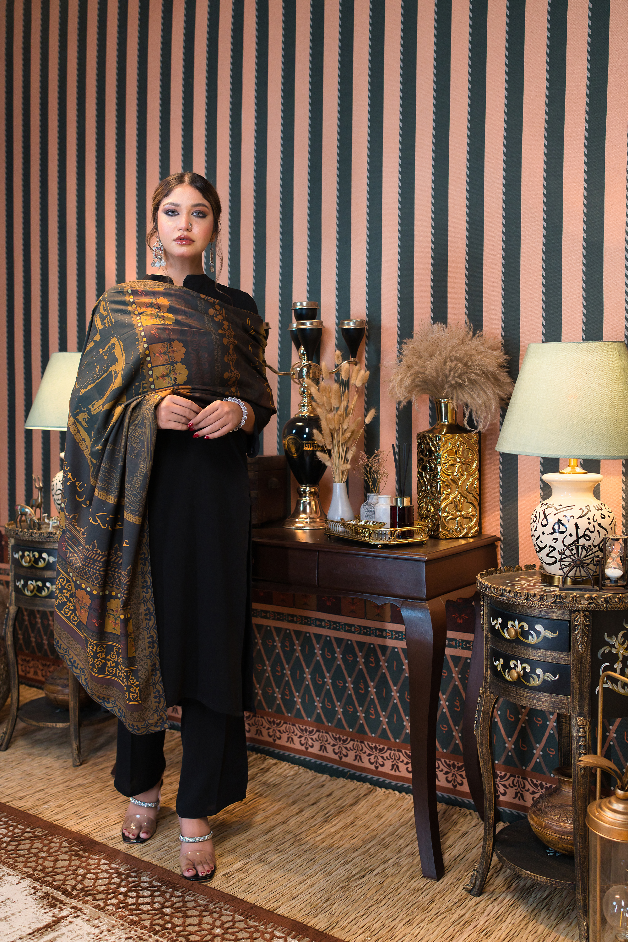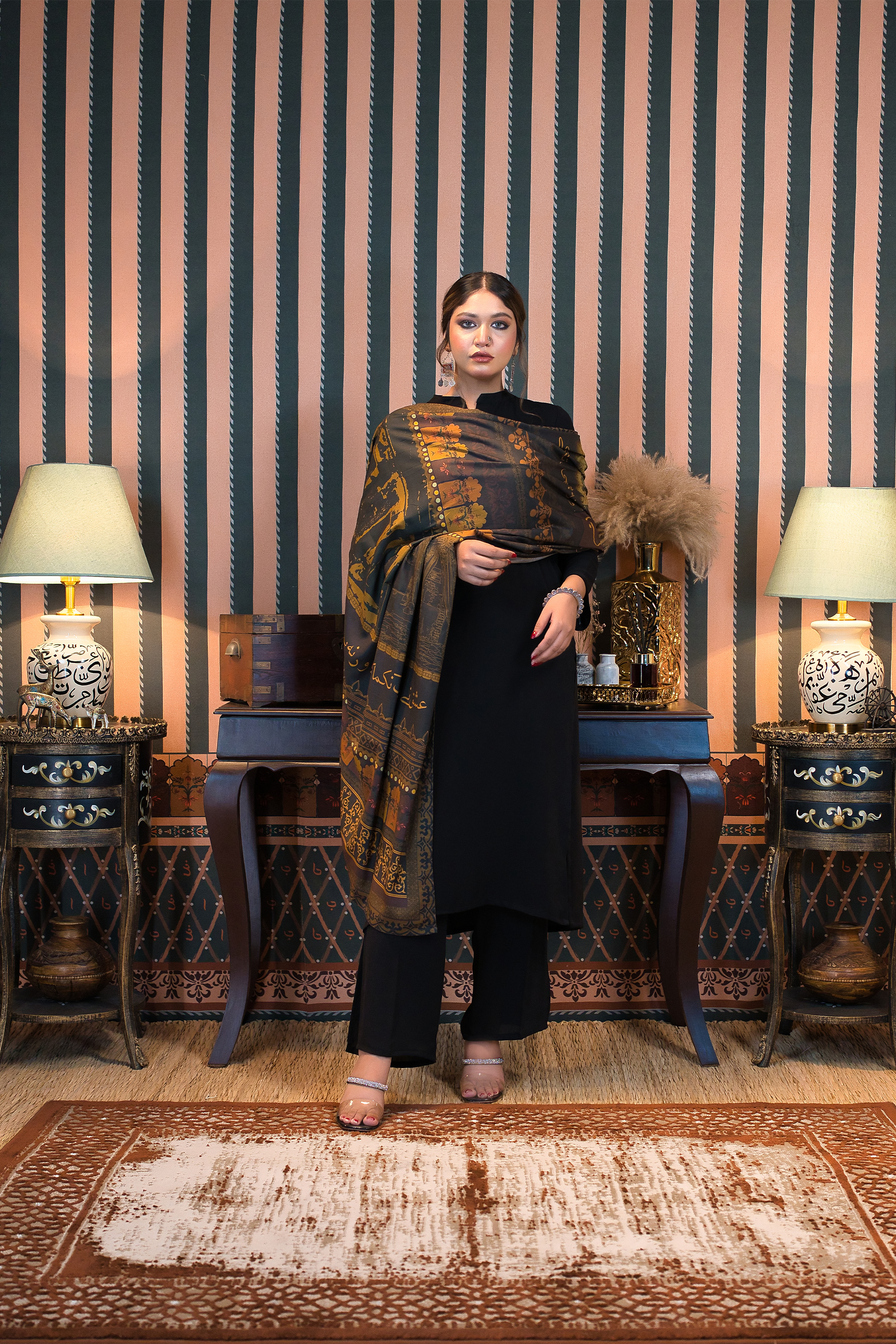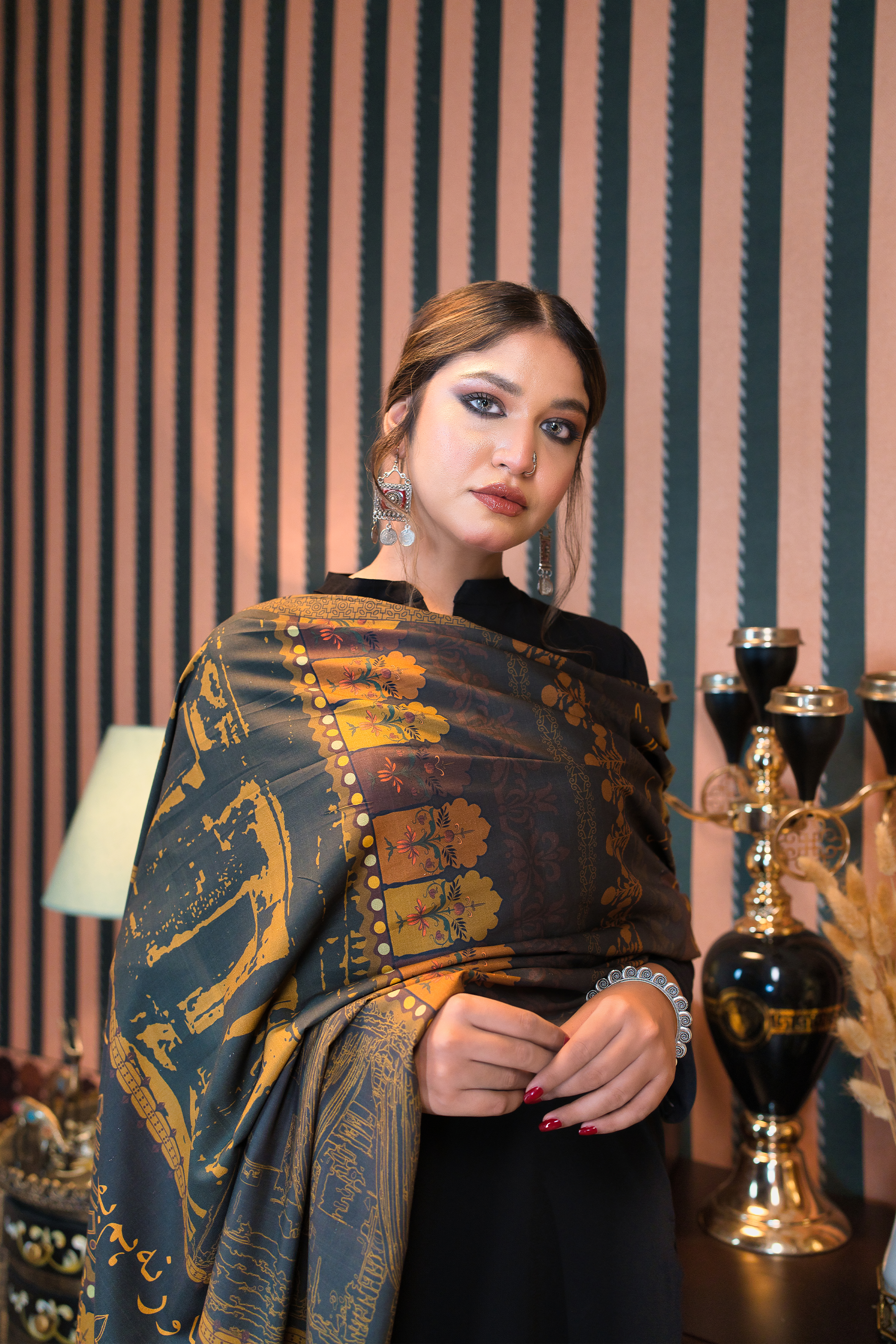 This dupatta is a perfect fusion of tradition and contemporary elegance. Bright orange and black colors add vibrancy and depth. The delicate inscriptions of Ghalib's poetry add cultural charm. This dupatta features a lightweight, breathable fabric. It's perfect for casual and semi-formal occasions.