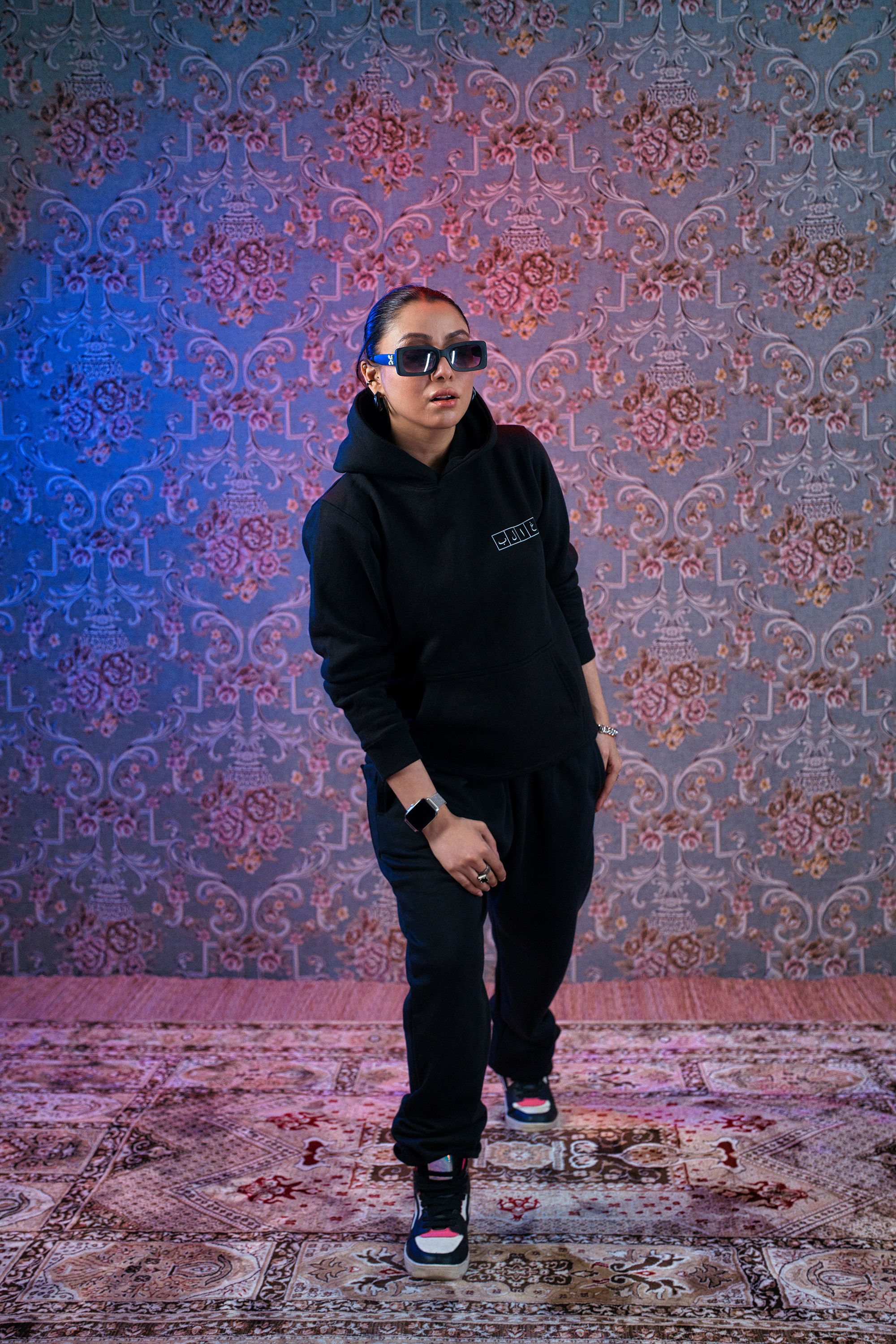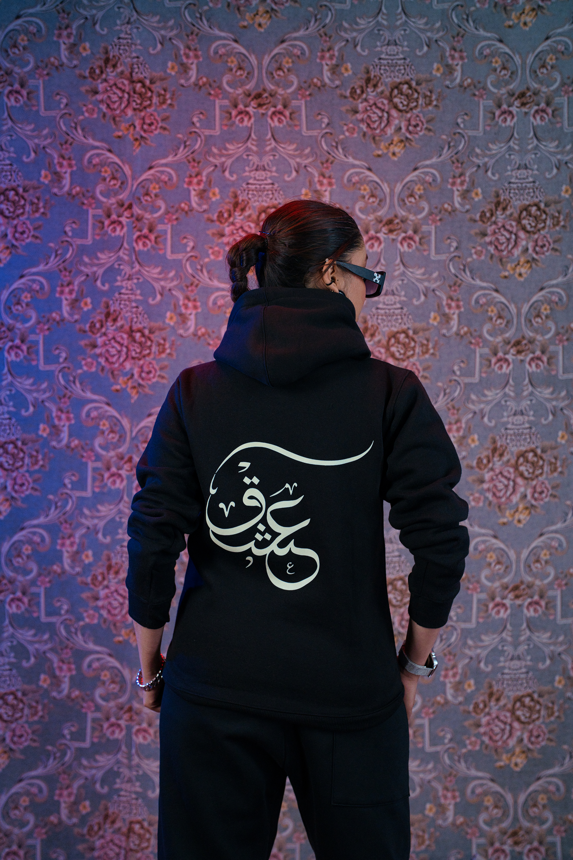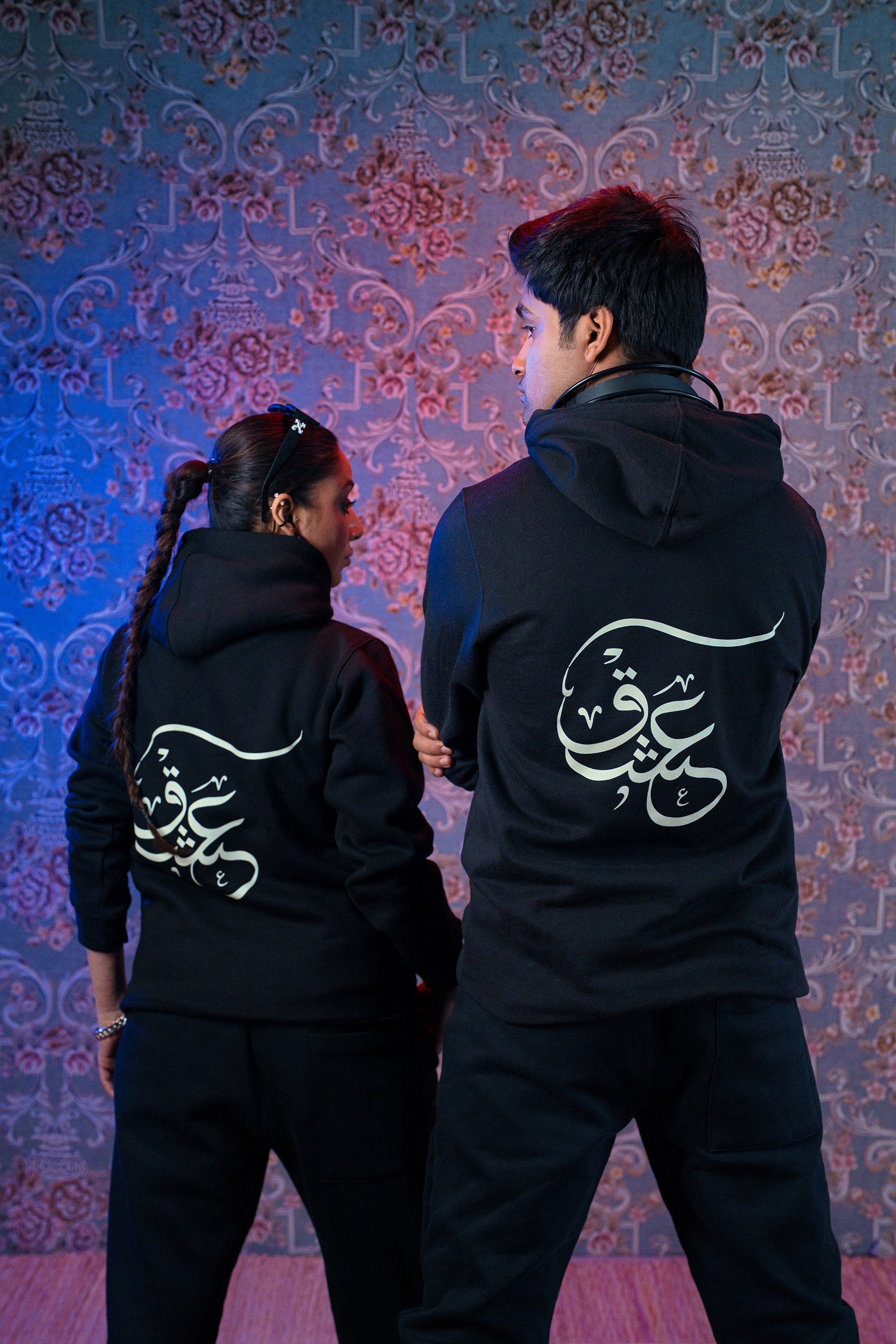 The Ghalib Ishq Hoodie and Sweatpants in black celebrate the eternal charm of Urdu poetry and modern fashion. This co-ord set blends comfort and artistic expression, featuring premium fabric with intricate Urdu calligraphy inspired by Ghalib's verses on love (Ishq). The hoodie includes a cozy drawstring hood, ribbed cuffs, and a relaxed fit, while the sweatpants feature an elastic waistband and tapered design for a snug yet stylish look. Perfect for casual outings or lounging, this set offers a timeless black-on-black aesthetic that complements any wardrobe.