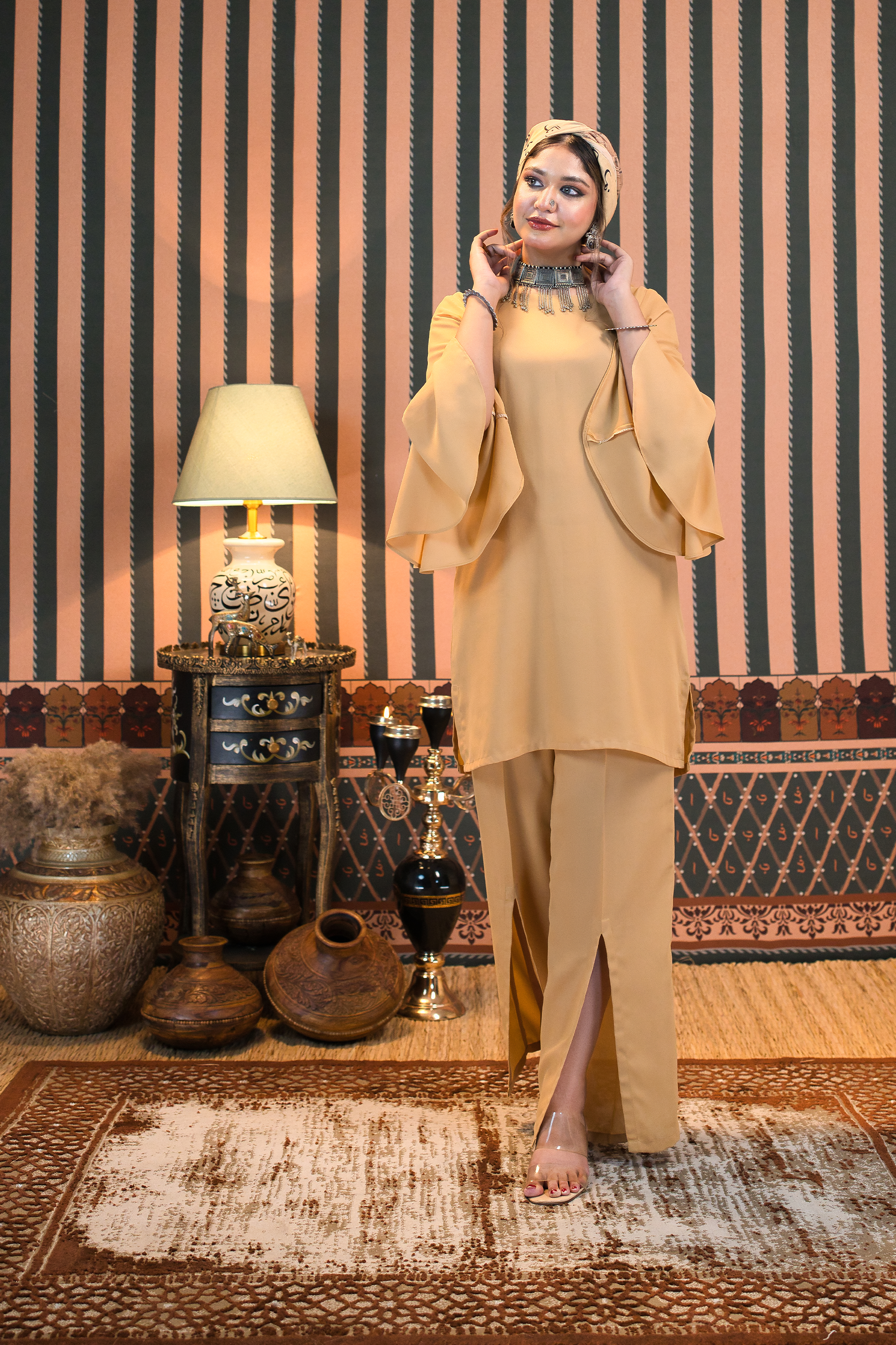 Grab Ghalib white poetry dupatta and Golden Brown Side Slit Co-Ord Set. It's a stylish outfit inspired by classic elegance and poetic beauty. It comes with matching trousers. It's perfect for a refined fashion statement. The outfit's highlight is the multi-colored green dupatta. It adds vibrancy and a touch of tradition. The set's intricate design draws inspiration from Mirza Ghalib's poetry. It celebrates a verse: