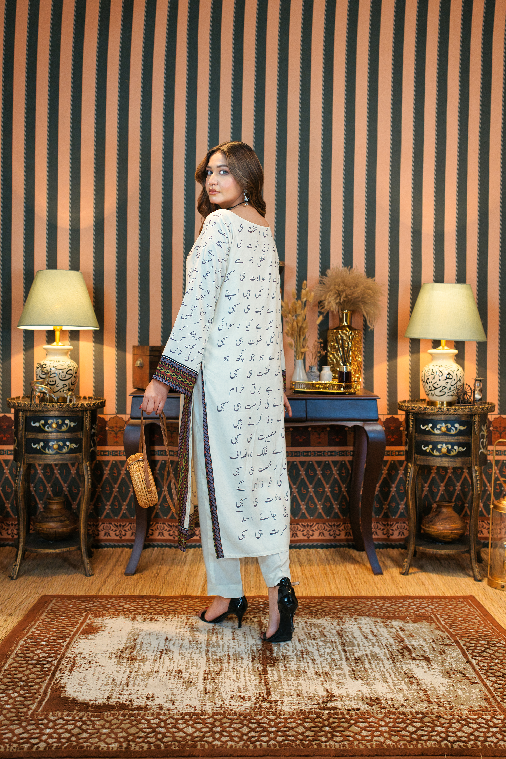 Experience the elegance of timeless poetry. Wear our White Hasrat-e-Wasl Printed Suit. The suit, inspired by Mirza Ghalib's deep verses, celebrates love's unspoken yearning. The white base symbolizes pure emotions. The delicate print shows a dance between longing and union.