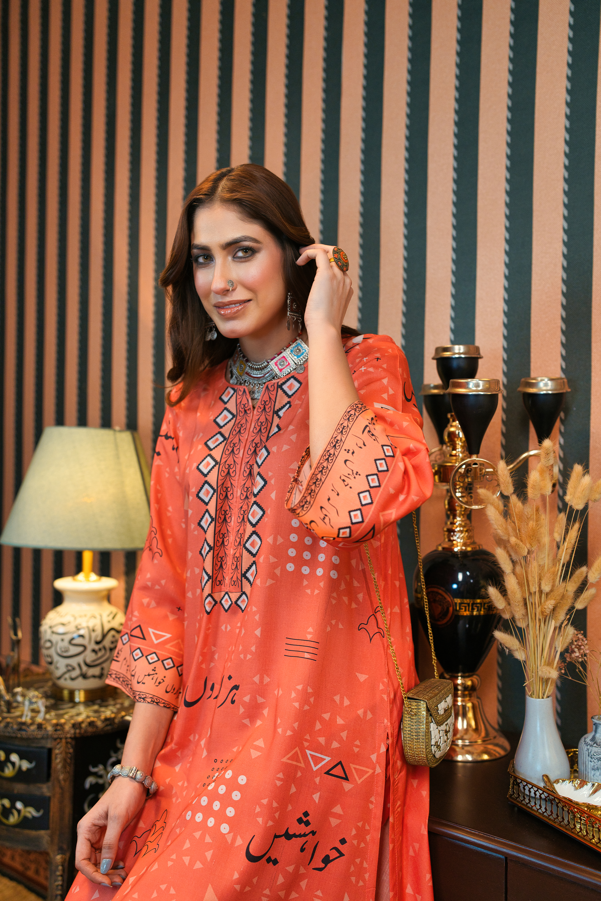 The striking combination of orange and black hues represents a perfect balance between warmth and sophistication, mirroring the passion and depth of emotions in classical Urdu poetry. The intricate print patterns are reminiscent of traditional South Asian artistry, making this ensemble not just a fashion statement but a celebration of heritage.