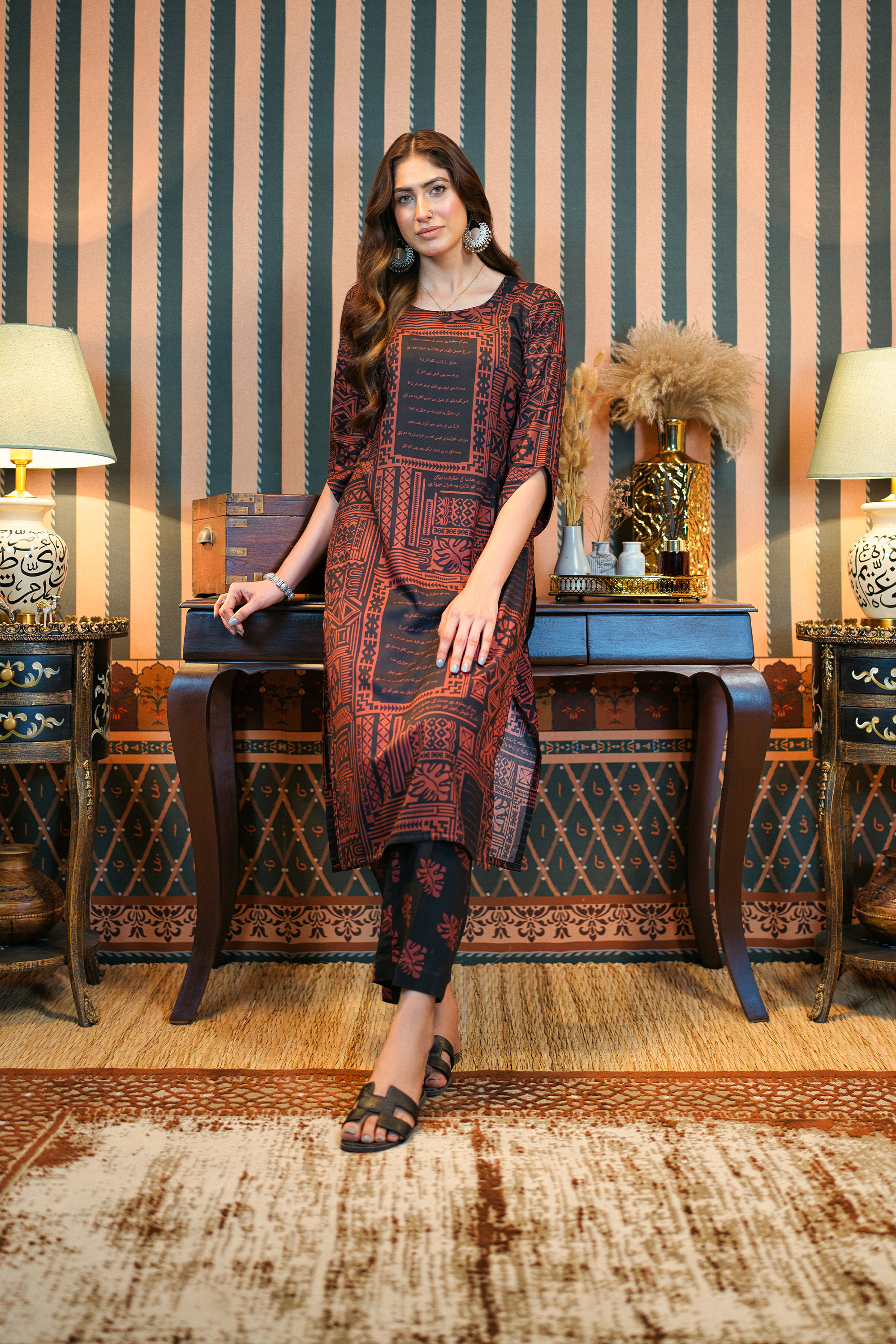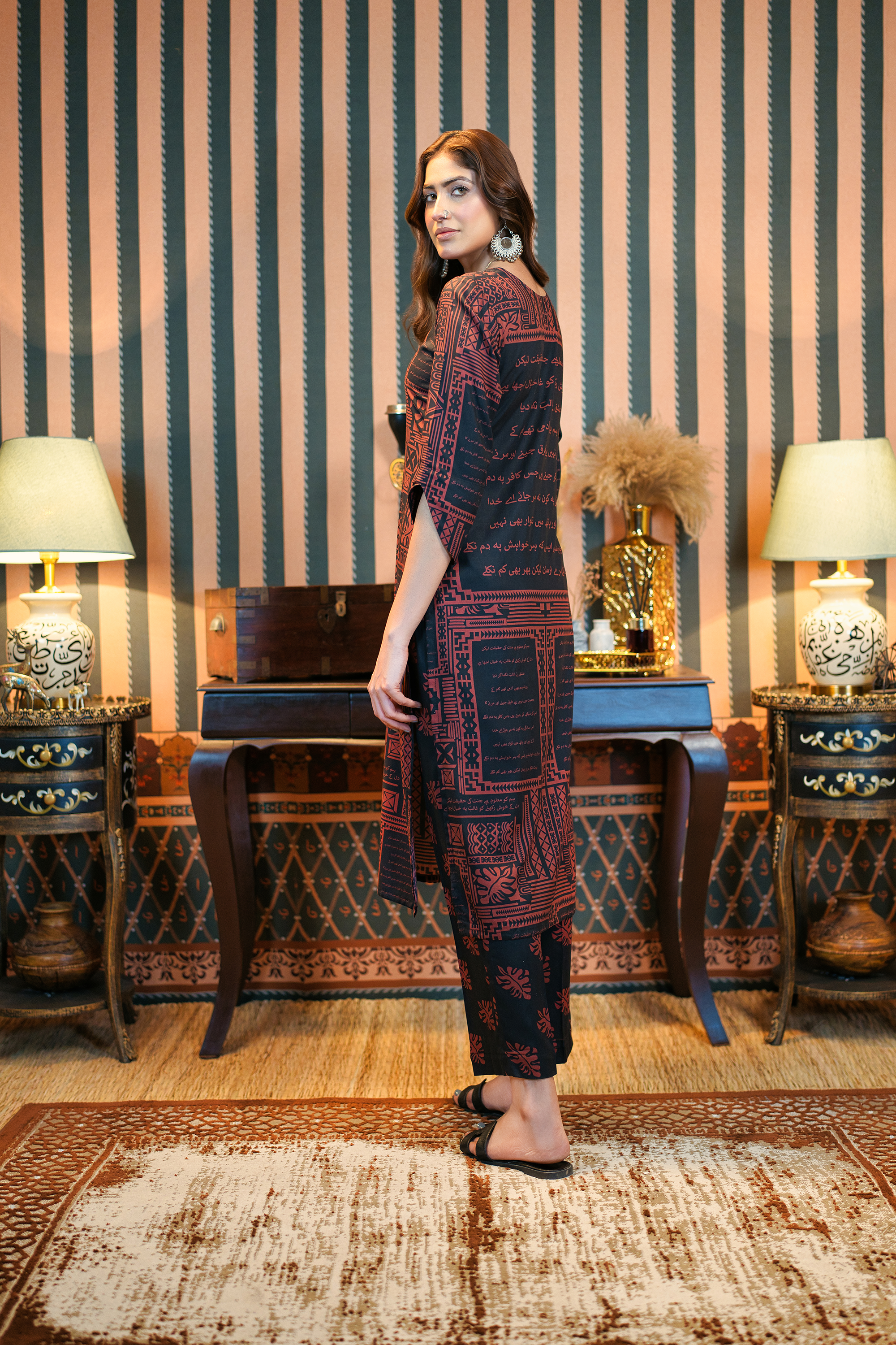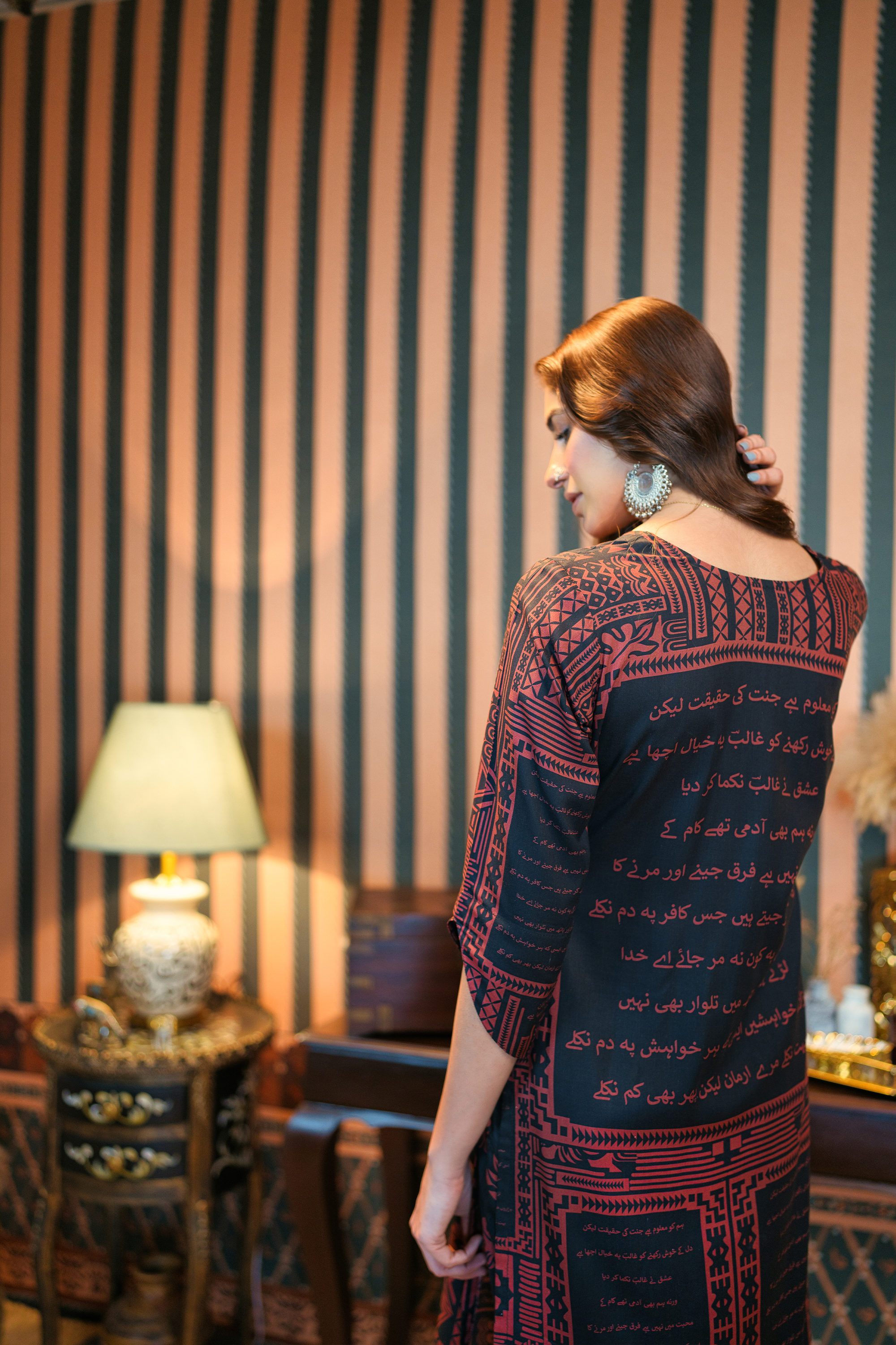 Just as Ghalib’s verse offers solace, this suit brings the warmth of cultural richness and modern charm to your wardrobe. The delicate print and vibrant contrast of black and orange evoke the feeling of festivity while grounding you in the traditions of our rich heritage.