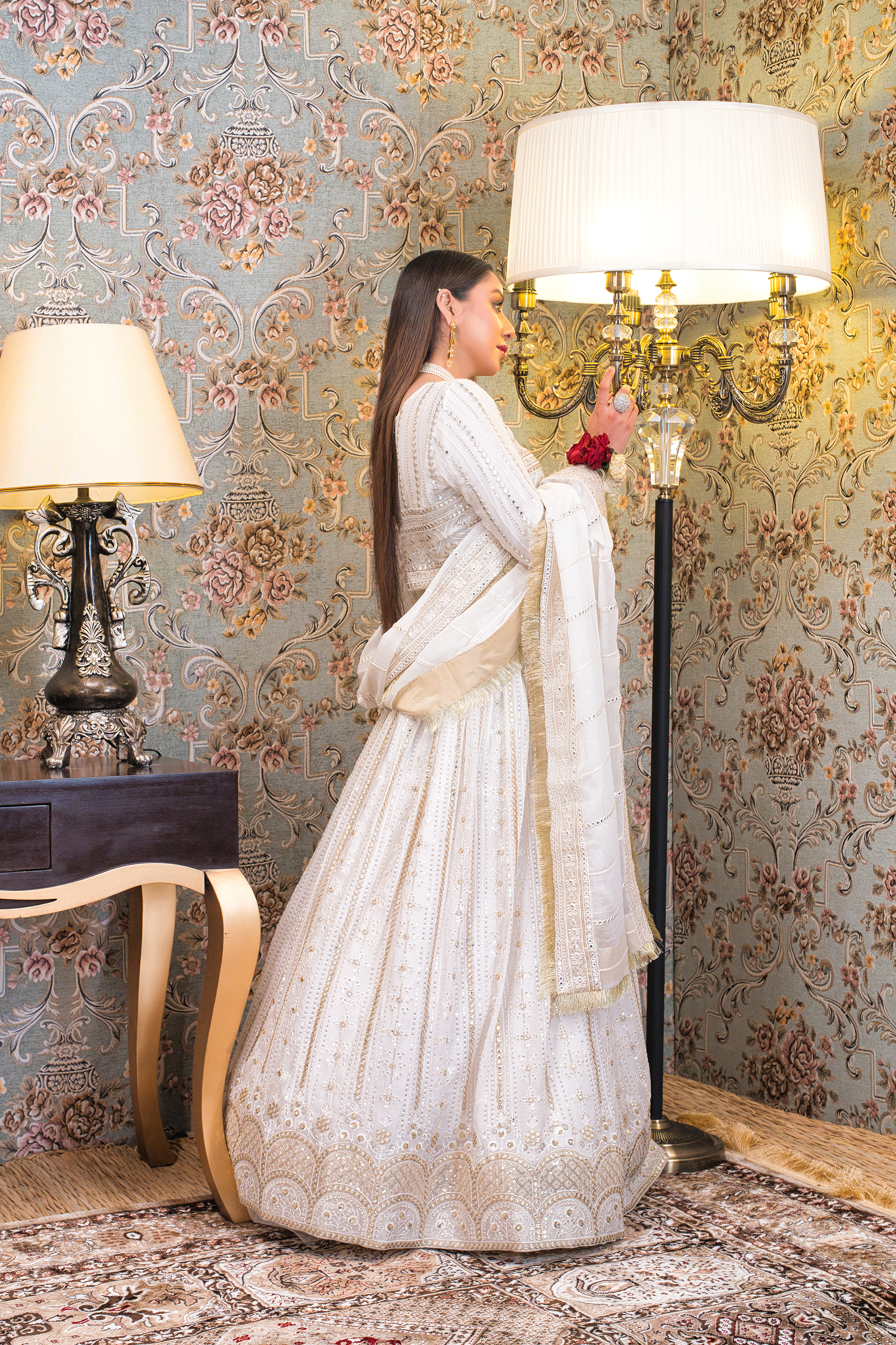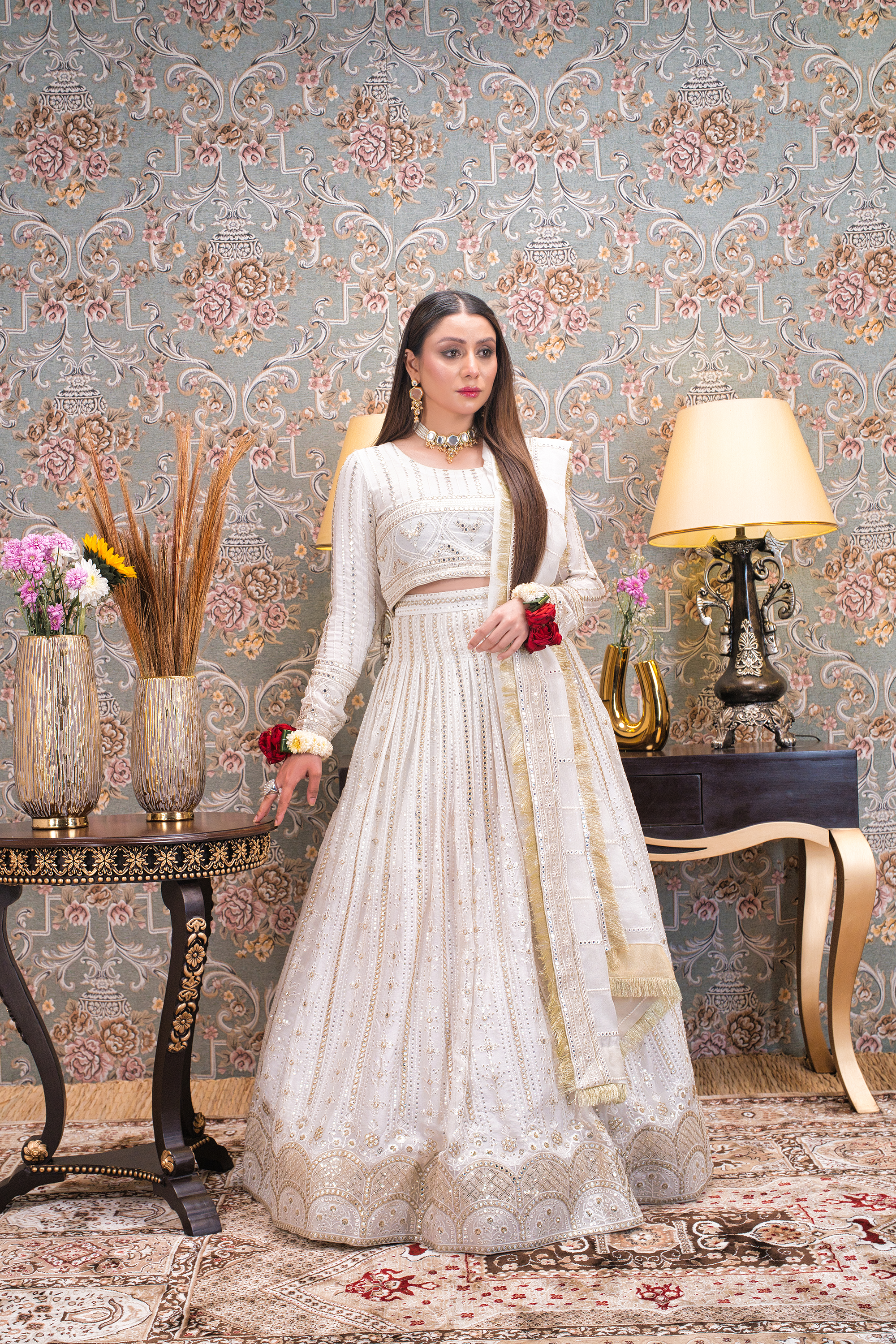 Make your Nikkah day unforgettable with this stunning White Lehenga Choli with Chiffon Dupatta, a masterpiece of elegance and craftsmanship. This bridal ensemble is designed to radiate grace and beauty on your special day.