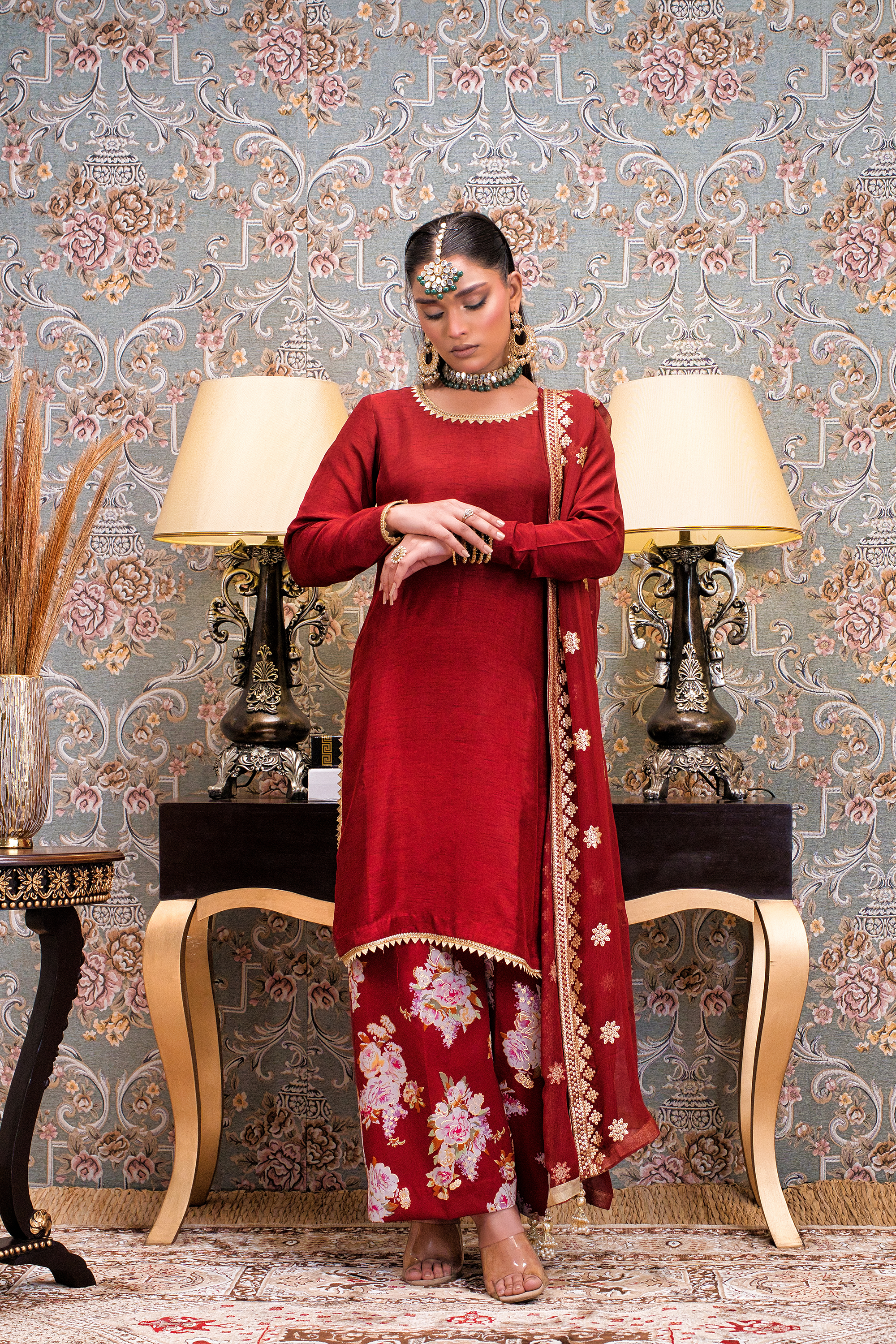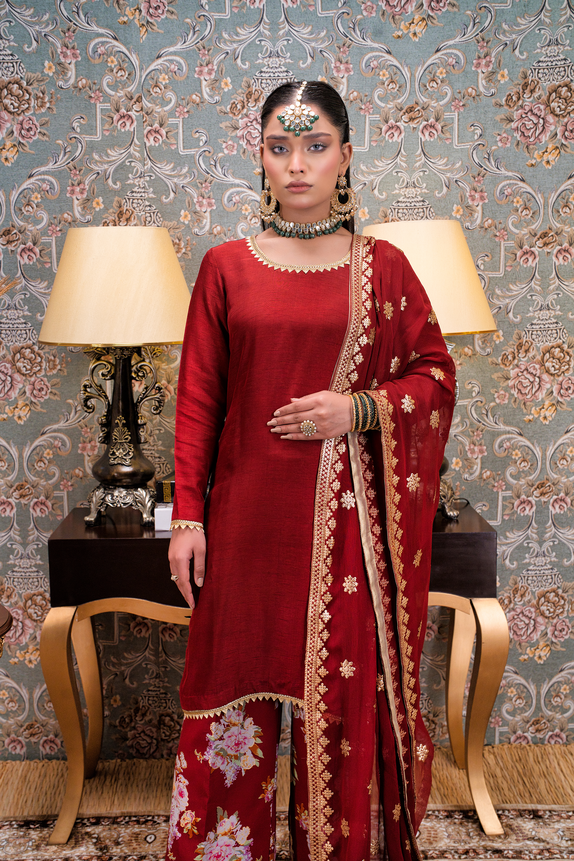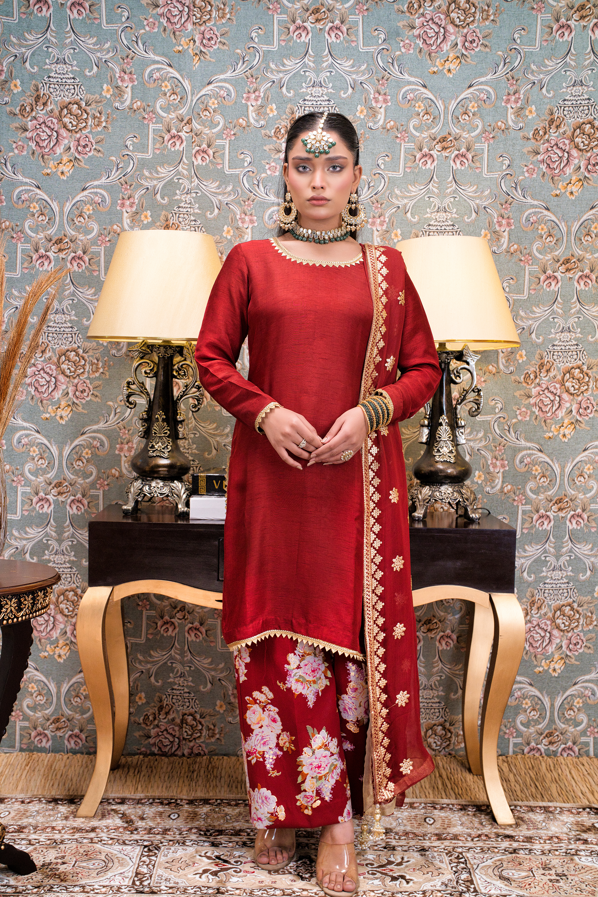 Experience timeless elegance with the Korean Silk Straight Shirt with Printed Trouser & Chiffon Dupatta, part of the stunning Prem Rassa Collection by Ghalib. This 2-piece outfit is designed to blend comfort and style for any special occasion.