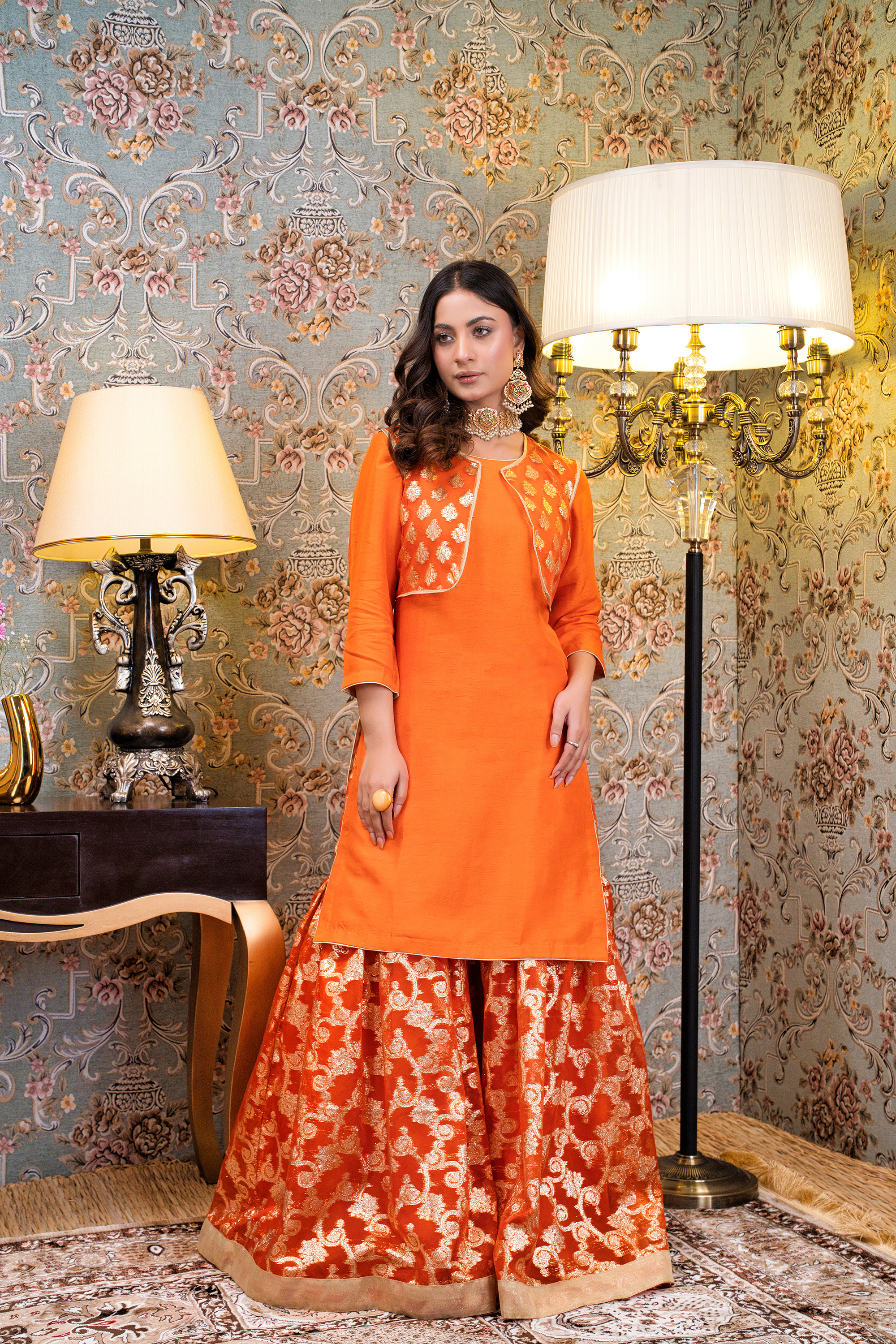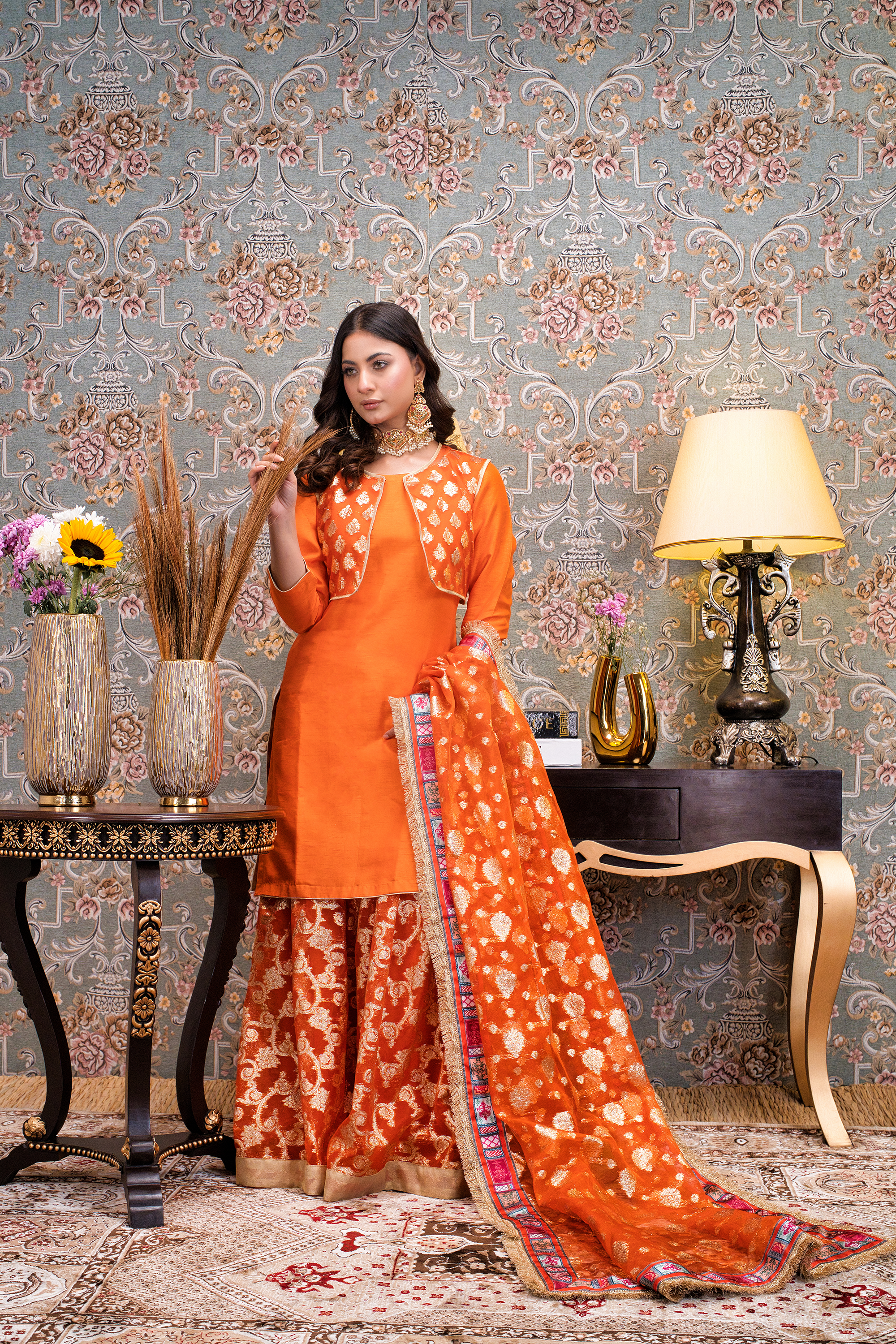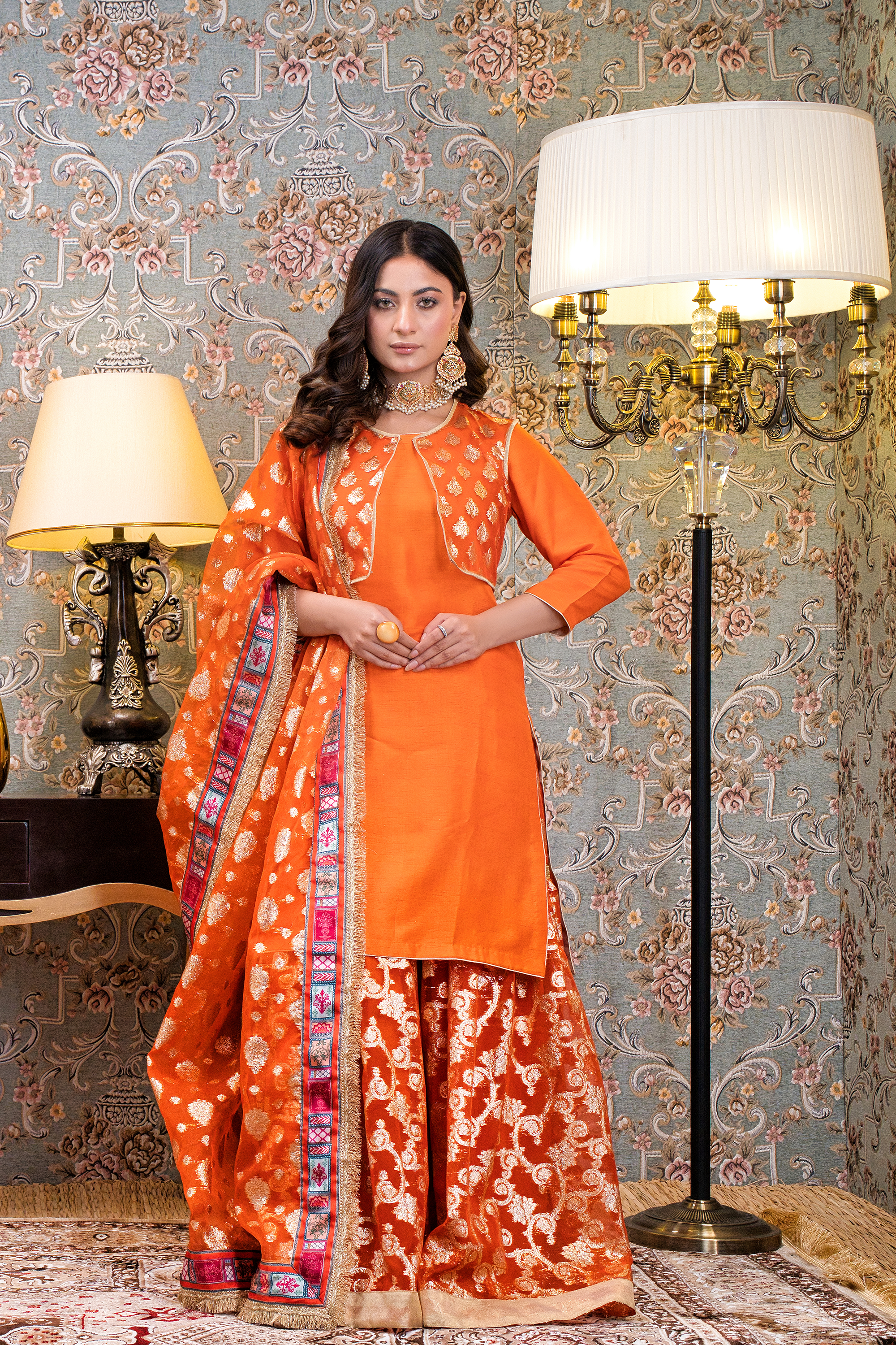 Elevate your ethnic wardrobe with our 4PC Shirt Sharara Set, featuring a stylish jacket and a beautifully designed dupatta. Crafted from premium fabric, this ensemble combines comfort and elegance, perfect for any festive occasion. The sophisticated silhouette complements all body types, while intricate detailing adds a touch of glamor. Step out in style and make a statement with this stunning outfit!