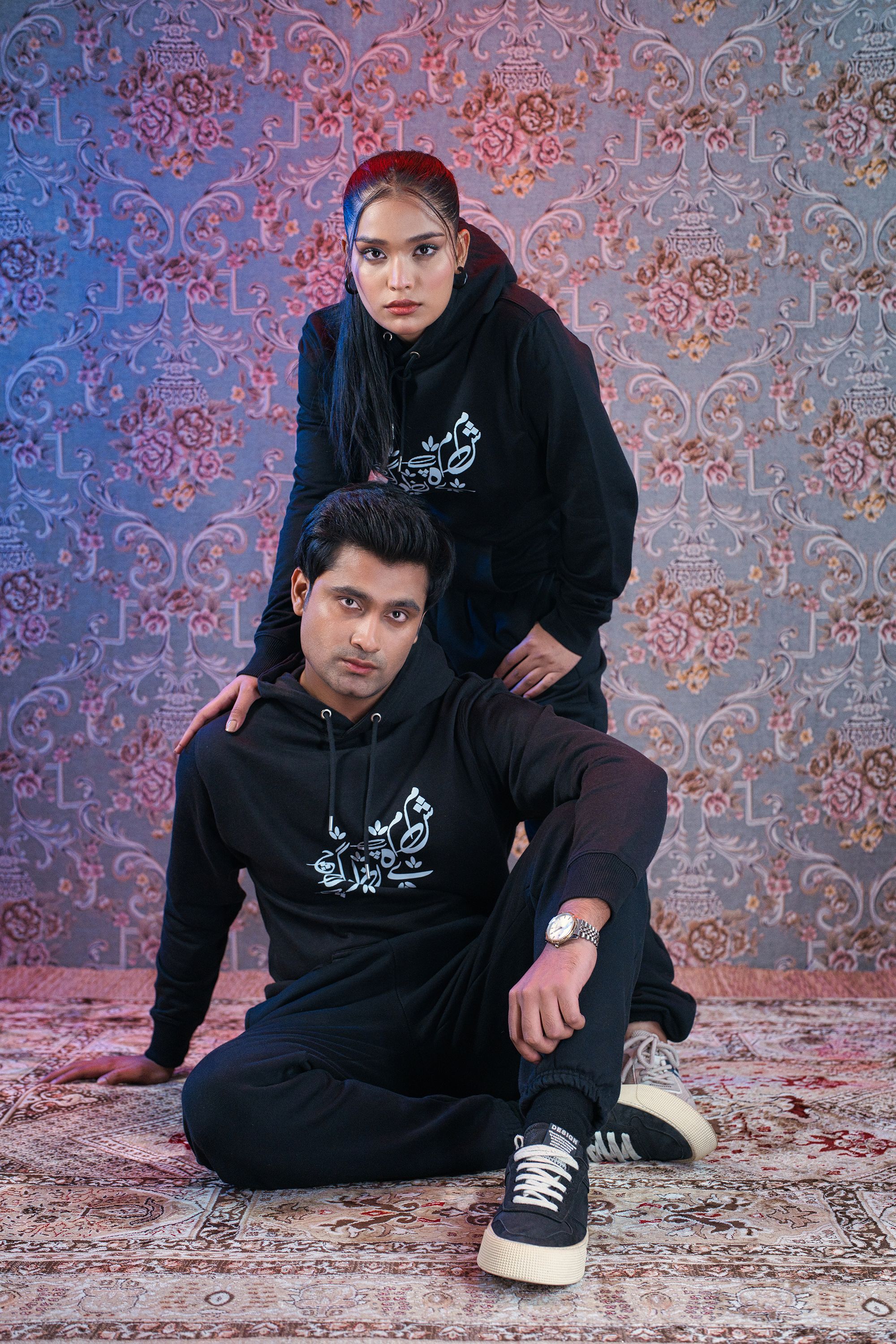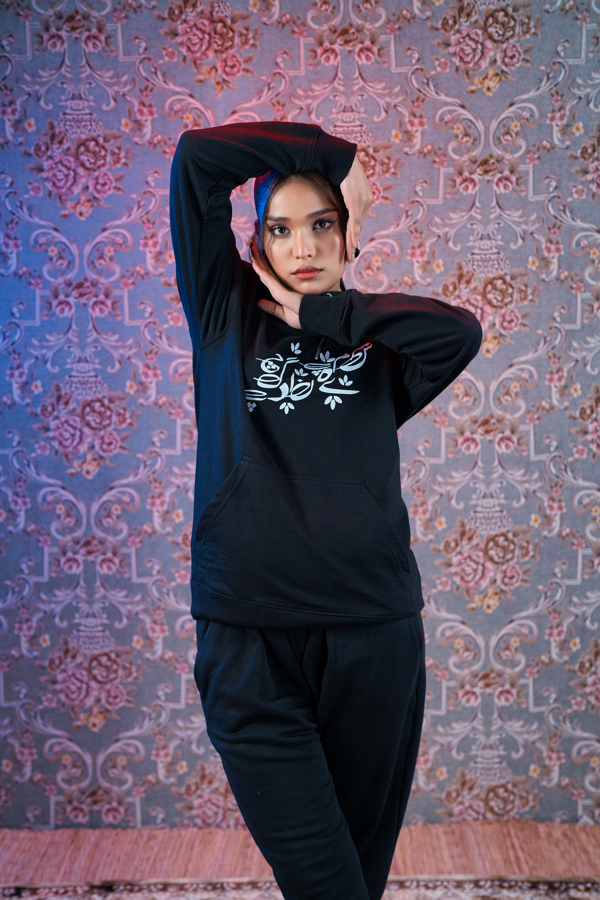 The Urdu Haroof Black Hoodie and Sweatpants from the Shayarism Collection by Ghalib celebrate the beauty of Urdu script through minimalist elegance. This black hoodie and sweatpants co-ord set showcases the Urdu alphabet in an artistic, modern design, reflecting cultural pride and contemporary style. Crafted from a premium cotton-polyester blend, the hoodie features a snug drawstring hood, kangaroo pocket, and ribbed trims, while the sweatpants offer a comfortable fit with an elasticated waistband and tapered legs.